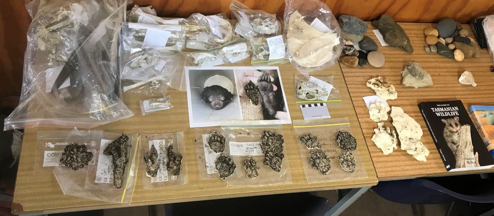 The photo I chose to share was of the Tasmanian Museum and Art Gallery Vertebrate Team's display table from Dr. David Hocking and Dr. Judy Clarke who showed plaster casts from prints found across Stony Head. They had displayed the skeletal remains and a cool possum skull. Of keen interest was seeing Dr. Hocking's 3D model software being used to illustrate signs of wildlife in a 3D setting. It's LIDAR capability allowed them to take amazing images of wombat burrows and tracks. The video can be seen here.