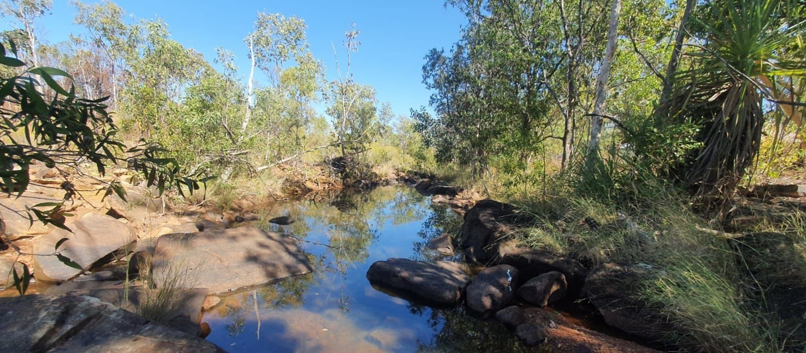 “Dingo!” Shouts Fiona, I turn around and see a dusty coloured dog slinking along the other side of the creek. It stops and looks at us inquisitively. Dr Glenn reminds us that we are in such a remote location that this dingo has probably never seen a human before. This is the second Dingo I have seen in the wild in my life, the other was a week ago on the road into Charnley River Station. What an epic adventure this has been.