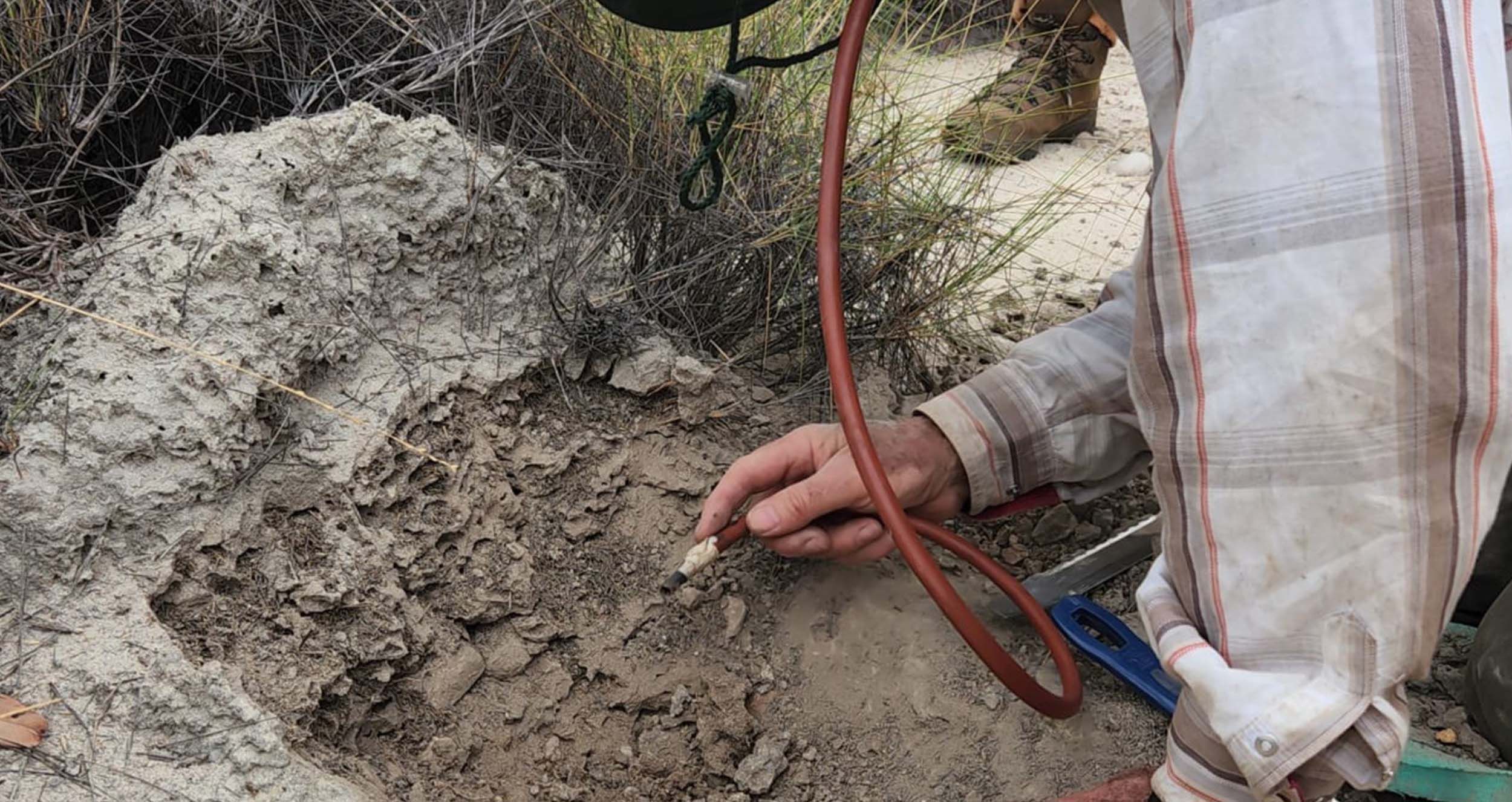 An early 6am start as we went to check the wire traps and Elliot traps. There were no small mammals in any of the traps, not even cane toads. There were, however, two micro bats in the harp trap. Heather caught them and put them in a canvas bag. She will use them for DNA samples. To identify them correctly you need to look at teeth type and that cannot be done while alive. These sample will be used by many other scientists. When we got back to base camp, we had a look at the bats. After interviewing Heather about her finds, we packed ready for a full day in the field. The helicopter took us to site E, a spinifex covered landscape. I joined Robert on the hunt for spiders. The spinifex was difficult to walk through and every step shot needles into the lower legs – incredibly itchy needles!! We wandered for a while searching for holes when Michael found one. Deciding it was an older one, Robert then stumbled across another one. This had silk around the top, indicating a tarantula was home. Robert settled in for a dig. He carefully scraped away the earth around it (it was just below a termite mound – inbuilt food) and found his way into the tunnels. He was able to extract her…and a baby tarantula as well!! He put them in a folded toilet roll (more high tech equipment) and put the baby into a vial with some earth.