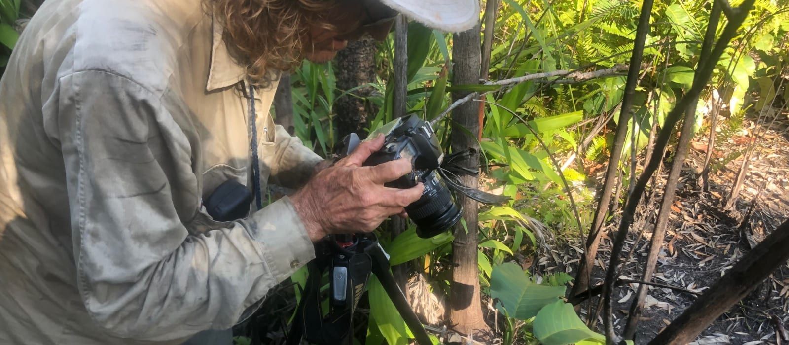 Even when collecting samples we seek not to leave a trace. Legendary scientist Kim Brennan from the Northern Territory Herbarium, photographs a dillenia specimen near the township of Umbakumba. While in the field scientists make as little impact as possible, both when collecting flora and fauna, this is both to preserve the habitat and to set an example for others to follow, including our budding student scientists.